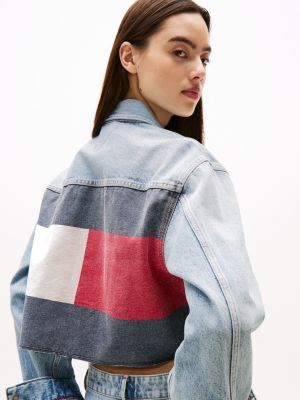 Rock an authentic branded look in this denim jacket with a cropped raw hem and signature statement on the back.