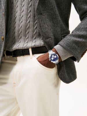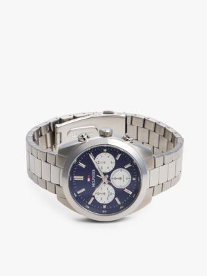 Introduce sports-luxe style to your accessories with this chronograph chain-link watch, featuring a striking blue dial with three sub-counters.