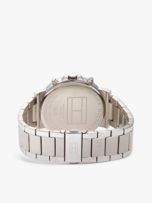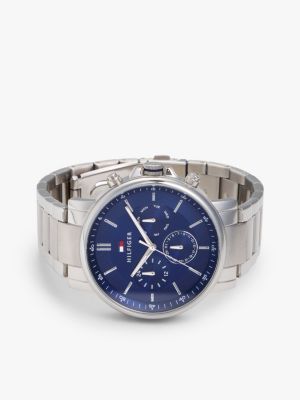A gleaming blue dial on this classic watch provides a sleek contrast to the stainless steel case and bracelet strap.