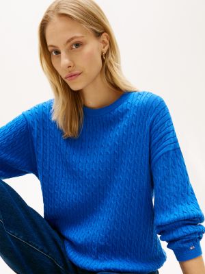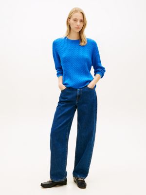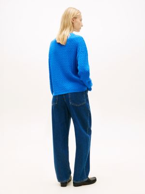 A relaxed silhouette adds contemporary style to this premium cable-knit jumper, crafted with a crinkled crepe texture and metal flag detailing.