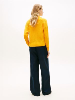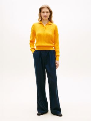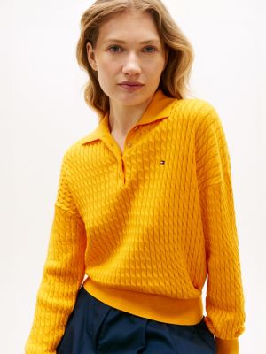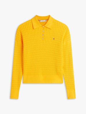 Gleaming gold-tone buttons and a traditional cable knit combine in this polo jumper, knitted from pure cotton in an intricate fine gauge.