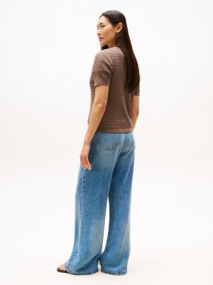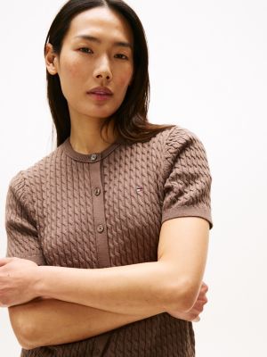 This short-sleeved cardigan with an intricate, fine gauge cable knit is a fresh take on a classic design, offering day-to-evening style.