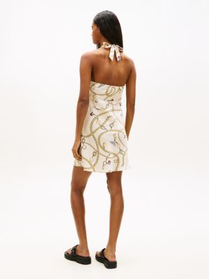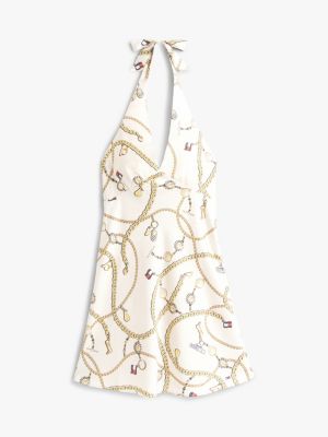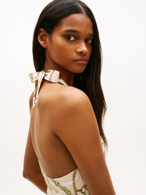 For that perfect bohemian look, turn to this slim-fitting halterneck dress with its crinkled texture and retro chain print.