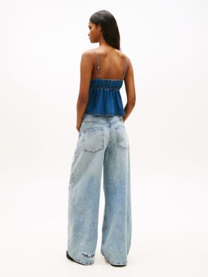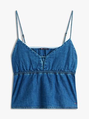This top showcases a slim silhouette with a flattering V-neck, while the chambray fabric and adjustable spaghetti straps elevate its femininity.