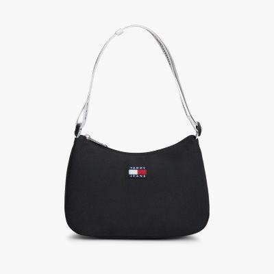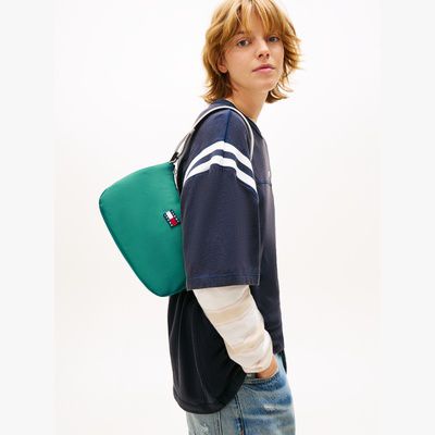 This shoulder bag features a minimalist silhouette with a sporty twist in the form of a repeat logo webbing strap.