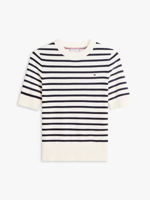 This jumper is knitted in a fine gauge to a T-shirt-inspired silhouette, with cuffed short sleeves and ribbed crew neckline.
