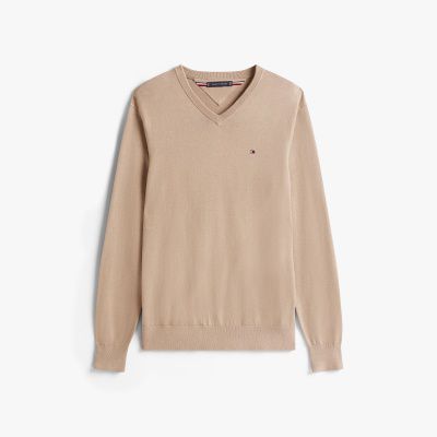 Bring a touch of sophistication to your layering with this pure combed cotton V-neck jumper, complete with flag embroidery detailing.