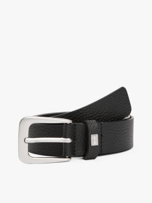This pebble-grain leather belt with a smooth rectangular buckle is elevated by the metal Tommy badge on the keeper.