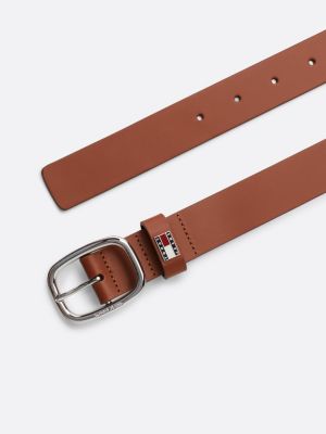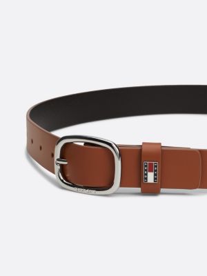 Add the finishing touches to your look with this luxe leather belt, featuring a debossed metal buckle and Tommy badge plaque.