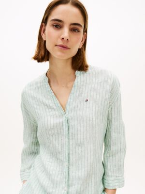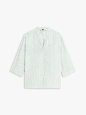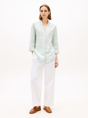 Bring a premium feel to laid-back styling with this pure yarn-dyed linen shirt featuring a collarless silhouette and relaxed half sleeves.