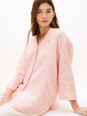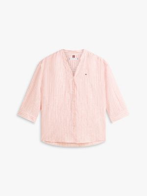 Bring a premium feel to laid-back styling with this pure yarn-dyed linen shirt featuring a collarless silhouette and relaxed half sleeves.