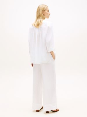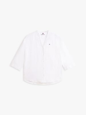 Bring a premium feel to laid-back styling with this pure yarn-dyed linen shirt featuring a collarless silhouette and relaxed half sleeves.