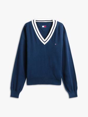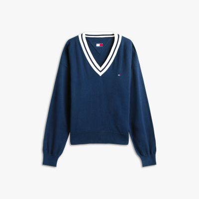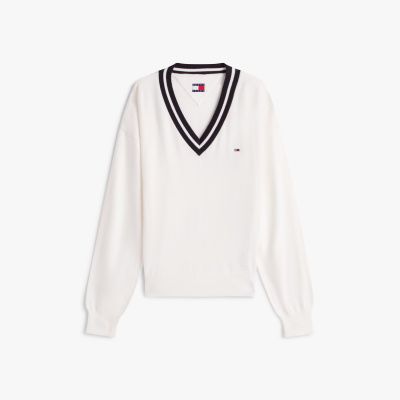 Enhance your knitwear collection with this V-neck jumper, cut to a relaxed fit and featuring distinctive varsity-inspired tipping on the collar.