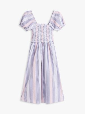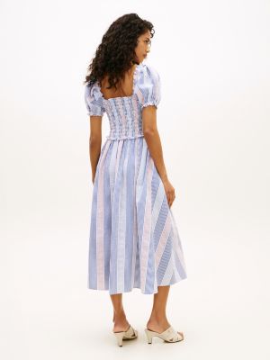Puff sleeves and frilled detailing add to the femininity of this smocked fit-and-flare midi dress, cut from textured pure cotton seersucker fabric.