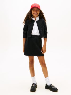 This sequin-embellished mini skirt features a stretch rib-knit texture and an elasticated waistband for a comfy fit on the party dance floor.