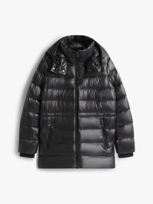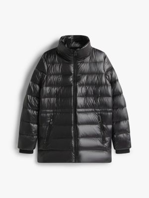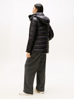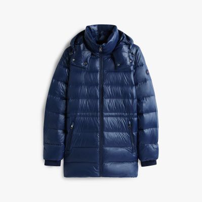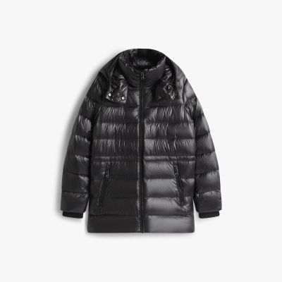 This hooded puffer coat is a luxuriously stylish way to wrap up, filled with warming down and showcasing a shiny water-repellent finish.