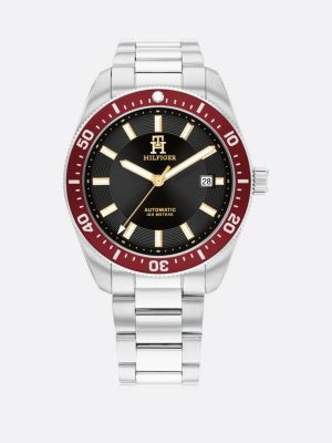 A dark red bezel lends a mysterious look to this sleek watch made from stainless steel and featuring a chunky chain-link strap.