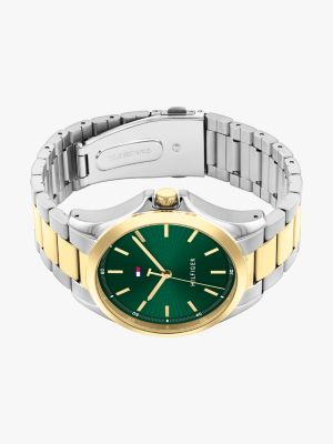 A two-tone strap, vibrant green dial and gold-plated stainless steel detailing give this bracelet watch a luxurious edge for creating elevated looks.